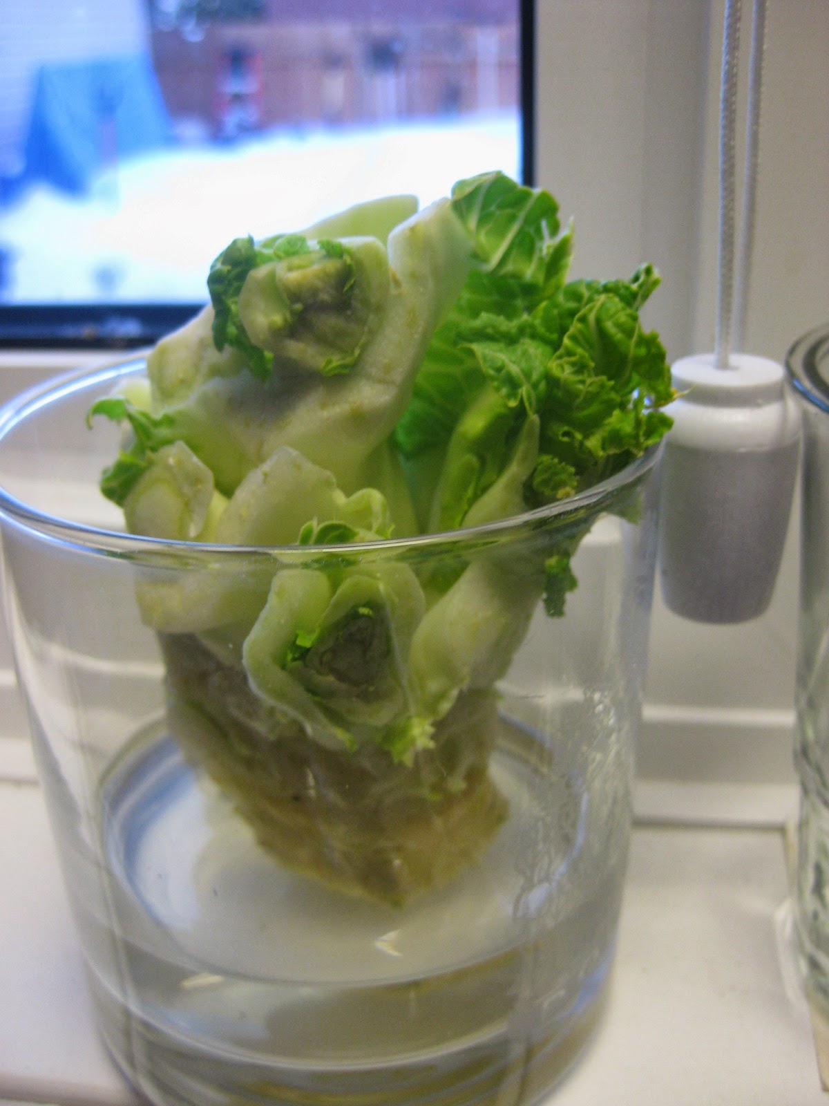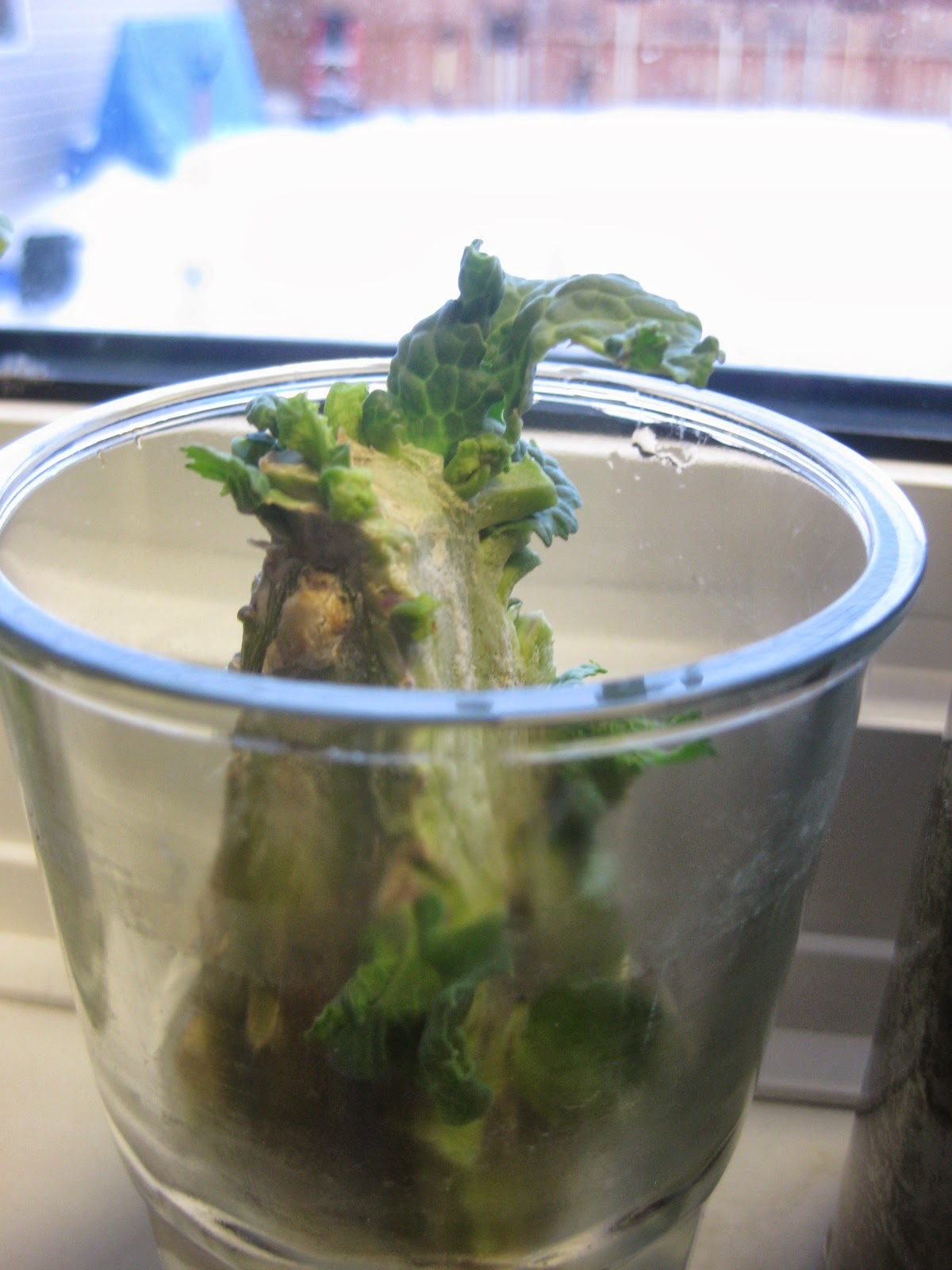 I have since potted the celery, cabbage, and red onion, the green onion is fine in a glass of water as I just cut the tops off when some is needed for whatever I am cooking. Not to worry though once the ground thaws and I have planted my garden, I will be transplanting these to a pot to give them rest and let them enjoy some much needed nutrients.